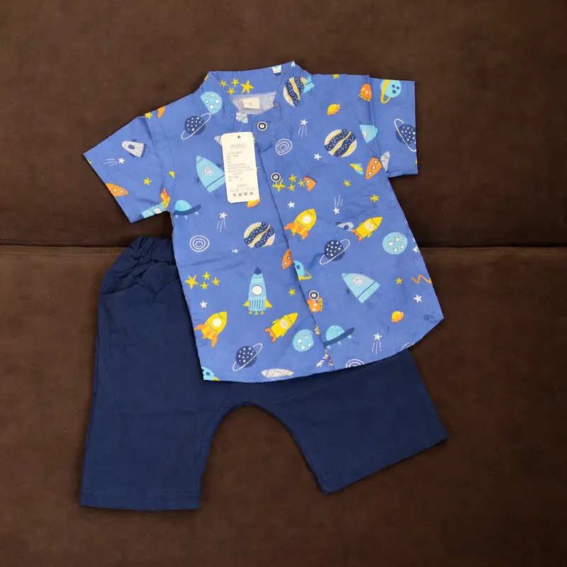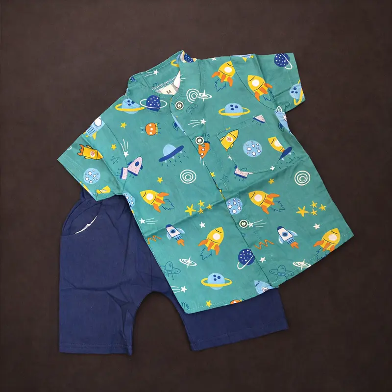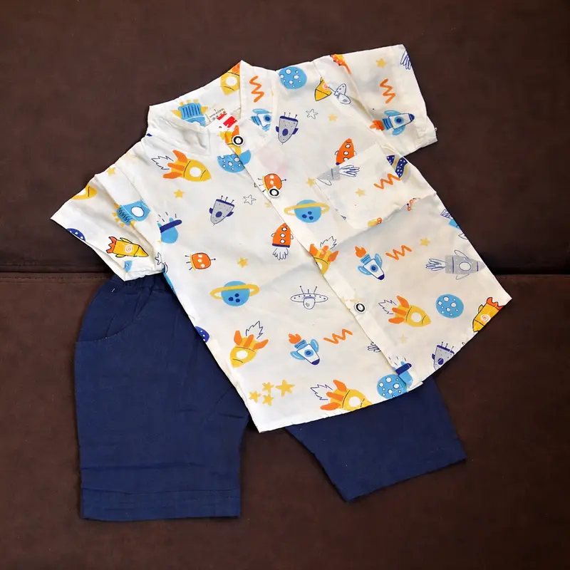 This outfit is specially designed for comfort, style, and everyday wear. The breathable cotton fabric keeps your baby cool during hot weather, while the lightweight half shorts allow easy movement for active kids. The trendy patterned shirt adds a stylish touch, making it suitable for family gatherings, playtime, outings, and casual occasions.